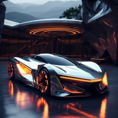 the futuristic car sits in a modern setting, in the style of light black and orange, 8k 3d, reimagined by industrial light and magic, flowing lines, firecore, polished metamorphosis, light yellow and light silver <lora:HTTP_20231128195717-000008:1>