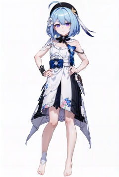 8k, best quality, masterpiece, (ultra-detailed:1.1), (high detailed skin), (full body:1.2), white background, standing, looking at viewer, solo, hand on hip, <lora:sgeleixiu-v100-000026:0.8:lbw=OUTALL>, gelei, 1girl, white dress, hat, blue hair, purple eyes, barefoot, little girl, 9 years old, (white background, simple background,:1.2), <lora:EnvyBetterHands LoCon_beta2 辅助:0.55>, ( good hands, nice hands:0.5), (beautiful_face), ((intricate_detail)), clear face, ((finely_detailed)), fine_fabric_emphasis, ((glossy)), full_shot