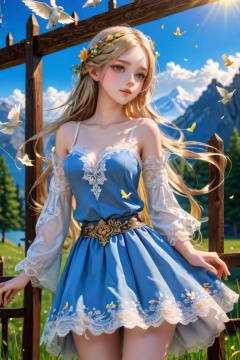 {masterpiece},{best quality},{1girl},Amazing,beautiful detailed eyes,solo,finely detail,Depth of field,extremely detailed CG,original, extremely detailed wallpaper,{{highly detailed skin}},{{messy_hair}},{small_breasts},{{longuette},{grassland},{yellow eyes},full body, incredibly_absurdres,{gold hair}.lace,floating hair,Large number of environments,the medieval ,grace,A girl leaned her hands against the fence,ultra-detailed,illustration, birds,Altocumulus,8kwallpaper,hair_hoop,long_hair,gem necklace,hair_ornament,prospect,water eyes,wind,breeze,god ray,lawn,Mountains and lakes in the distance,The skirt sways with the wind,The sun shines through the trees,A vast expanse of grassland,fence,Blue sky,bloom,smile,glow,The grass sways in the wind,<lora:659095807385103906:1.0>