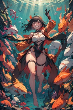 illustration, masterpiece, best quality, extremely detailed, wallpaper, 8k, mysterious, vivid color, shiny, best quality, intricate, good anatomy, beautiful lighting, 1girl, solo, full body, barefoot, light smile, underwater transparent sealed hemispherical glass dome, koi, Underwater, Dome, light particles, light rays, cowboy shot, wide shot, volumetric lighting, detailed eyes,