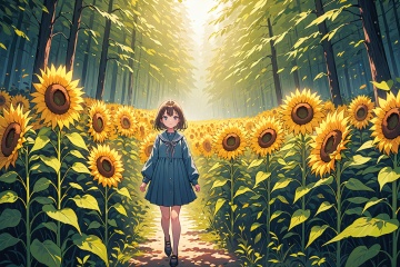 ultra-detailed,(best quality),((masterpiece)),(highres),original,extremely detailed 8K wallpaper,(an extremely delicate and beautiful),anime,\\,best quality,aesthetic,detailed,by poire,1girl,solo,long sleeves BREAK outdoors,forest,field of sunflower,BREAK\\,BREAK