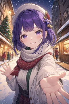 ultra-detailed,(best quality),((masterpiece)),(highres),original,extremely detailed 8K wallpaper,(an extremely delicate and beautiful),anime,1girl,raiden shogun,purple hair,solo,looking at viewer,smile,BREAKExaggerated perspective,ultra wide shot,reaching out hand,foreshortening,on the tokyo street,realistic,highres,female focus,solo,snowy day,scarf,hat,flying snow,fish-eye len,fish eye angle,ambient occlusion,rim lighting,bustling,The streets at night wall in the Christmas,Red and green theme,Christmas dress,Christmas Hat,Christmas tree,Christmas elements,BREAK<lora:XL 超级雷神_1.0:0.7>,