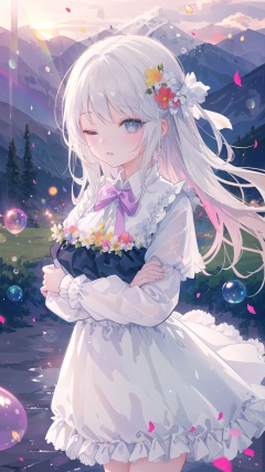 masterpiece,best quality,high detailed,1girl, solo,, smile, eyes closed, parted lips, arms out, outside, balloon, bonquet, cloud, sunset, mountains, grass, flowers, petals, (wind), breeze, rainbow,bubbles of imagination and fantasy, dim light, dreamy atmosphere,(depth of field, blurry, blurry background, bokeh:1.2)