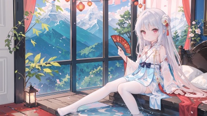 ((1girl)),yunduan,hanfu,solo,lying on bed,bed in garden,(half naked),holding,round fan,paper fan,thin hanfu,smoky,((red curtain)),red lantern,(bamboo),tile roof,naked hanfu,off shoulders,dudou,legs,gongbi style,water color,(trees, artificial mountain,flowers, green leaves),wooden windows,doors,bed,stone,trandional architecture,wall,long hair,looking at eachother,full body,breasts,lips,bangs,nose,closed mouth,medium breasts,distinct,idol,soft smile,white pantyhose, panties under pantyhose