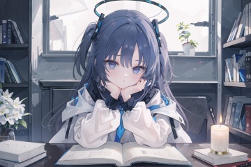extremely detailed CG unity 8k wallpaper, masterpiece, best quality, ultra-detailed, an extremely delicate and beautiful, night, dark, dim candlelight, candle, messy study room, many books, grimoire, book stock, magic girl, sleepy, head rest, black robe, vase, finely detail,