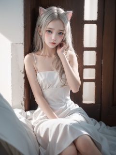 (aesthetic, digital art),a digital illustration of a cat-girl with long white hair,dressed in a white dress,huddled in a corner and crying,(anime style:1.2),teary-eyed expression,(cat ears:1.2),adorable and vulnerable features,(emotional:1.1),heart-wrenching atmosphere,(white dress:1.2),flowing fabric accentuating her delicate figure,(loneliness:1.3),isolated and desolate setting,(sadness:1.2),tears streaming down her face,(empathy:1.1),evoking a sense of compassion,(corner:1.3),curled up in a small space,(hair covering face:1.2),concealing her emotions,(subtle lighting:1.1),soft and muted colors,(emotional storytelling:1.2),capturing a moment of vulnerability and sadness.,ears down,blue eyes,eyesseye,