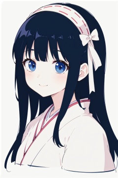 1girl, solo, long hair, black eyes, black hair, white clothes, japanese clothes, kimono, bangs, ribbon, hair ribbon, blunt bangs, hairband, looking at viewer, simple background, smile, white background, portrait, upper body
