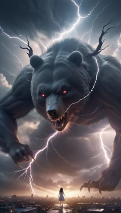 <lora:xl-shanbailing-1215白棱monster-000002:0.9>,bailing_monster,a huge monster passes through the clouds,outdoors,(1girl:0.5),darkness,city,mitsu_masaya,huge,cloudy,thunder,electricity,warlord,DCG,epic scenes,special effects,huge waves,realistic photo,ultimate light and shadow,cast a spell,(bear:1.1),