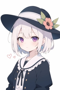 Straw hat,quality_best, style_onineko, (Distinct pupils)(Clear eyes), 1girl, solo, c, earrings, looking at viewer, flower, short hair, bangs, closed mouth, simple background, black headwear, white background, red flower, upper body, white hair, hair intakes, frills, purple eyes, hair ornament, expressionless, hat flower, eyelashes, best quality
