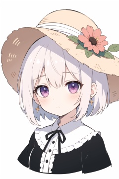 Straw hat,quality_best, style_onineko, (Distinct pupils)(Clear eyes), 1girl, solo, c, earrings, looking at viewer, flower, short hair, bangs, closed mouth, simple background, black headwear, white background, red flower, upper body, white hair, hair intakes, frills, purple eyes, hair ornament, expressionless, hat flower, eyelashes, best quality