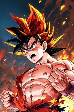 (best quality,  masterpiece), 1boy,  male focus,  solo,  muscular,  abs,  open mouth,  son goku,  pectorals,  muscular male,  torn clothes,  spiked hair,  topless male,  black hair,  clenched hands,  upper body, red halo, angry,  fazhen,<lora:EMS-2496-EMS:0.800000>,<lora:EMS-244110-EMS:0.800000>,<lora:EMS-68495-EMS:0.800000>