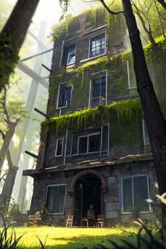 scenery, hat, building, window, city, outdoors, standing, ambiguous gender, coat, multiple boys, boots ,ruins, overgrown, scenery, sunlight, tree, outdoors, light rays, nature, grass, moss, blurry, post-apocalypse, forest, depth of field, sunbeam, building, day, plant, blurry foreground, sitting, artist name //////////////////////, <lora:﷿丽的光影:0.2>,<lora:add_detail:0.35>, <lora:adaptedmodel:0.35>