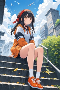 1girl,orange shoes,solo,sitting,sky,clouds,outdoors,black hair,bird,upward view,blue sky,white socks,daytime,orange jacket,building,long sleeves,leaves,long hair,stairs,red headband,pump Rope,headband,bangs,cloudy sky,from_below,wide_shot,