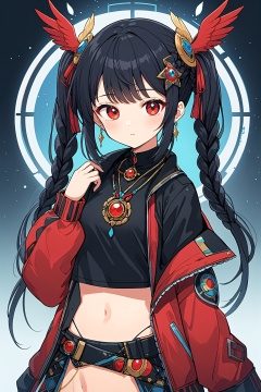 a girl in a red and black outfit with a bird on her head,Senketsu Illustration,portrait of a magical girl,Flat anime style,wearing a tribal outfit,full art illustration,blue cyborg,short twin tails,dribbble style illustration,One Eye Red,jewelry,upper body,earrings,braid,twin braids,necklace,black hair,jacket,long hair,bangs,shirt,red jacket,black shirt,circle,long sleeves,1girl,navel,anime style,