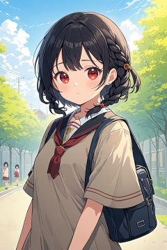 Anime style illustration,1girl,short black hair,red eyes,looking at viewer,half body,holding a school bag,wearing a seifuku,under the clear day sky,high resolution illustration,A full art illustration in a flat anime style, her twin braids and jewelry adding to her charm. An upper body portrait of this unique character with one eye red