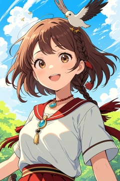 A magical girl in a red and black tribal outfit,with a bird perched on her head. A full art illustration in a flat anime style,her twin braids and jewelry adding to her charm. An upper body portrait of this unique character with one eye red,Girl Smiling Skyward,Studio Ghibli Film Style,Blushing,Joyous Expression,Promotional Film Still,Brunette Girl,Low Angle View,Charming Character Design,Zookeeper,Round-faced Character,Windy Scene,Medium Close Shot,Sunlit Scene,Excited Mood,Milk Element,Flying Hair,Opening Scene,Bashful Expression,Arik Roper Art Style,Solo Girl,Sky,Cloud,Brown Hair,Smile,Brown Eyes,Open Mouth,Blue Sky,Jewelry,Daytime,Shirt,Necklace,Viewer Engagement,White Shirt,Outdoor Scene,Short Hair,looking at viewer,