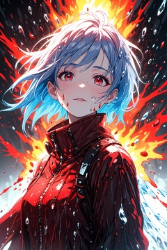 ultra wide angle,(in Atompunk style:1.2),red colors,surrounded by bloody drops,exaggerated perspective,cume bloody drops,(a mother of burning ice:1.3),8k,octane render masterpiece,masterpiece scale,beautiful depth of field,ultra wide field,ultra detailed CG perspective,ultra dynamic lighting amazing shadows,dramatic lighting,(by Agnes Cecile:1.1),
