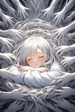 (masterpiece, best quality, high resolution),white hands emerging from a singularity,sleeping face,many hands,vortex,intricate detail,8k,hdr,