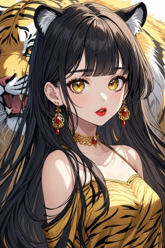 black hair, long hair, jewelry, tiger, earrings, looking at viewer, 1girl, solo, makeup, red lips, upper body, yellow eyes, wavy hair, eyeshadow, closed mouth, animal, lips
