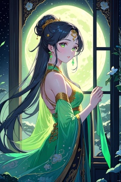 In the quiet (Moon Palace:1.2),(Chang 'e: 1.5) , (wearing neon clothes: 1.5), fairy temperament, her skin (ice muscle jade skin: 1.4), her eyes revealed a hint (sadness and pain: 1.4), (her hand gently caress the windowsill), as if thinking about their past and future,