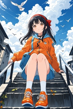 1girl,orange shoes,solo,sitting,sky,clouds,outdoors,black hair,bird,upward view,blue sky,white socks,daytime,orange jacket,building,long sleeves,leaves,long hair,stairs,red headband,pump Rope,headband,bangs,cloudy sky,from_below,wide_shot,