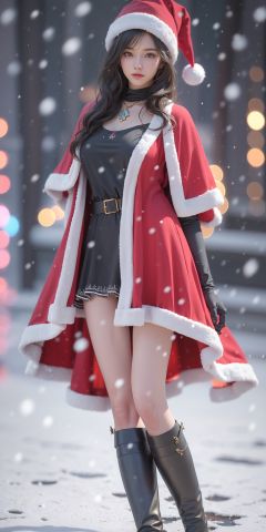 <lora:SHENGDAN_20231218215514:0.75>,<lora:HDR:0.5>,SHENGDAN,1girl,solo,hat,long hair,santa hat,blurry,fur trim,red capelet,black hair,bangs,blurry background,depth of field,red headwear,snowing,(black eyes:1.4),santa,red dress,, (raw photo:1.2),((photorealistic:1.4))best quality,masterpiece,illustration,an extremely delicate and beautiful,extremely detailed,CG,unity,8k wallpaper,Amazing,finely detail,masterpiece,best quality,official art,extremely detailed CG unity 8k wallpaper,absurdres,incredibly absurdres,huge filesize,ultra-detailed,highres,extremely detailed,beautiful detailed girl,cinematic lighting,1girl,pale skin,tall female,(perfect body shape),skinny body,Slender legs,