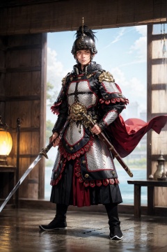 masterpiece, best quality, 32k uhd, Epic CG masterpiece, hdr,dtm, full ha,8K, ultra detailed graphic tension, dynamic poses, stunning colors, 3D rendering, surrealism, cinematic lighting effects, realism, 00 renderer, super realistic, full - body photos, super vista, super wide Angle, HD, exquisite facial features, super delicate face, normal arms, realistic,reflective water, looking at viewer,martial arts,chinese armor,1boy, solo,full body, standing, fighting stance, holding sword, chinese sword, sheath, chinese clothes, cape, chinese black headwear,helmet, chainmail, breastplate, chinese black footwear, destroy the ground,chinese ancient battlefield, cloud, black theme,