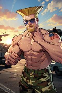 Guile, blond hair, flattop, beard, shoulder tattoo, muscular, looking at viewer, sunglasses, camo pants, topless male, sweat, Air Force Base, morning, outdoors, sun, upper body, (insanely detailed, beautiful detailed face,beautiful detailed eyes, masterpiece, best quality) ,smile, solo, <lora:Guile-10:0.7>