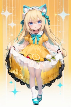 (cinematic lighting), dreamy atmosphere, Ray tracing, (((solo))), (loli:1.5), (child:1.5), (petite:1.5), green eyes, (animal ears), dress, solo, food, blonde hair, open mouth, long hair, pancake, flower, holding, bow, smile, fork, bird, socks, looking at viewer, shoes, striped background, holding fork, bonnet, striped, frills, long sleeves, :d, yellow dress, bangs, eyebrows visible through hair, blush, green nails, hair bow, nail polish, diagonal stripes, chick, sparkle, frilled dress, orange bow, fruit, full body, :3, hair between eyes, green bow, puffy sleeves, heart, lemon, orange footwear, animal ear fluff, white bow, cat ears, bobby socks, orange headwear, see-through sleeves, blue background, striped bow, hair ornament, white legwear, mary janes