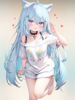 petite, loli, solo, animal ears, heart, puffy short sleeves, blue hair, long hair, off shoulder, bangs, hair ornament, gradient background,rainbow gradient, x hair ornament, animal ear fluff, looking at viewer, very long hair, blush, smile, cat ears, bare shoulders, collarbone, hand up, gradient sweater, hair between eyes, symbol-shaped pupils, arm up, heart-shaped pupils, hairclip, medium breasts, salute, bare legs,full body