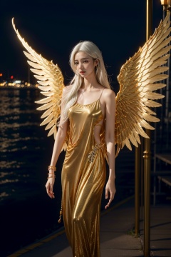 jinyingnvshen,masterpiece,best quality,1girl,exquisite details,set at night by the seaside,white hair,golden wings,jewelry,<lora:jinyingnvshen-000004:0.7>,