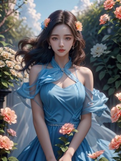 (Good structure),HDR,UHD,8K,A real person,Highly detailed,best quality,masterpiece,1girl,realistic,Highly detailed,(EOS R8, 50mm, F1.2, 8K, RAW photo:1.2),ultra realistic 8k,(best illumination, best shadow, extremely delicate and beautiful),(official art, beautiful and aesthetic:1.2),solo,1girl,long hair,Wind,flowing hair,kind smile,pose for picture,looking_at_viewer,perfect body,wedding dress,(blue dress),(blue theme),jewelry,Garden background,(Floating flower),flowers,liuyifei,dachangtui,HUBG_CN_illustration,crystal,,,