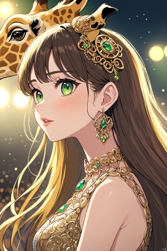 (Masterpiece, best quality, super quality, 8k, ridiculous, crazy detail, intricate detail, hyperdetail, high detail, hyperdetail, reality: 1.4), brunette, long hair, jewelry, giraffe, earrings, watching the audience, 1girl, solo, makeup, upper body, green eyes, wavy hair, eyeshadow, closed mouth, animal, lips, anime style,