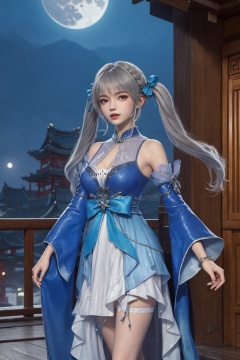 1girl, twintails, ribbon, solo, detached sleeves, hair ribbon, blue ribbon, dress, parted lips, long hair, photo inset, personification, bracelet, grey hair, architecture, jewelry, blue dress, wide sleeves, east asian architecture, looking at viewer, blurry, brown eyes, night,moon,moonlight,high heels, jewelry, Clothing ribbon,standing,full body,looking at viewer,lights,butterflies, depth of field, blurry,reflection,light rays,rotational symmetry,angelcore,(cowboy shot),(spirit:1.2),(standing:1.3),bedroom,the dynamic perspective is splashing,mercury,Electroluminescent Wire,Dreamy Glow, white,sky,indoors,floating hair,floating dress,floating snow,ultra-detailed, highres, extremely detailed,best quality ,masterpiece, illustration, extremely delicate and beautiful,CG ,unity ,8k wallpaper,Amazing, finely detail,official art, <lora:图图的哩布圣诞制服特辑(壹)_V1.0:0.3>, <lora:dingdang-linqingtanxs:0.55>