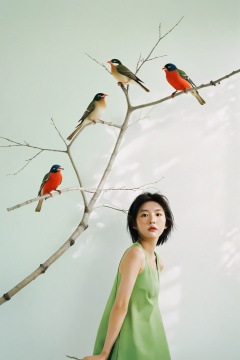 young girl on the branch of tree with birds and a bird sitting on top of it, in the style of japanese minimalism, beautiful and exquisite face, photo-realistic hyperbole, light green and red, formalist aesthetics, uniformly staged images, fashion photography, oversized objects,1girl