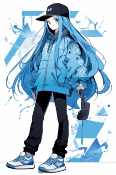 niji,1girl,best quality, masterpiece, anime, female, blue hair, black outfit, hat, blue sneakers, left hand holding something blue, background with text and abstract patterns, face covered by a grey square