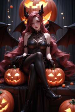 <lora:DaoTeMM_20231029114527:0.6>,DaoTeMM,Devil,crossed legs,black dress,Epic CG masterpiece,hdr,dtm,8K,ultra detailed graphic tension,dynamic poses,stunning colors,3D rendering,surrealism,cinematic lighting effects,realism,00 renderer,super realistic,super vista,HD,halloween costume,spooky attire,trick-or-treating,jack-o'-lantern,