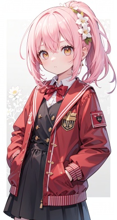 (best quality), ((masterpiece)), (highres), original, extremely detailed wallpaper, (an extremely delicate and beautiful),(loli),(petite),Pink hair,Yellow eyes, (red Jacket),high ponytail,white collared shirt,hair flower,fipped hair,floating hair,Frown,hands in pockets,black dress,red bowtie,(solo)
