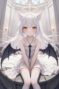 white hair,yellow eyes,looking up,stockings,long hair,hime cut,messy hair,floating hair,demon wings,halo,cross necklace,holy,divinity,shine,holy light,cat girl,(loli),(petite),solo,