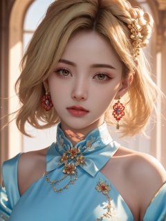 1 girl,****_female , (medium breasts:), upper body,(masterpiece, top quality, best quality, official art, beautiful and aesthetic), (1girl),extreme detailed eyes, (fractal art:1.3), highest detailed, (perfect face), shiny skin, HDR, galaxy, (light streaks), striking visuals,tutututu, see-through, (cheongsam), cheongsam, tutututu, girl,red earrings,red jewelry, 1 girl, blonde hair,1girl,