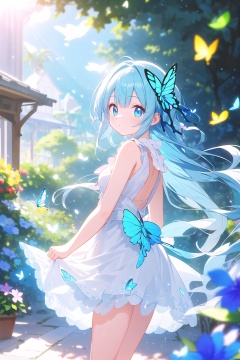 wide shot,(depth of field),global illumination,soft shadows,grand scene,backlight,lens flare,((colorful refraction)),((cinematic lighting)),in the market,from side,looking outside,with butterfly,1girl with lightblue long hair and blue aqua eyes,hair flowers,hime cut,sunlight,blurry background,blurry,White Dress,