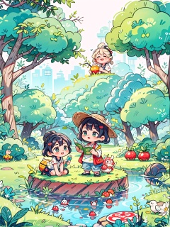 Best Masterpiece, (Childlike Fun), Cute Style, Creative Children's Illustration, Hot Summer, By (Rice Field), Green Rice Field, lush Branches and Leaves, Summer, Cicada Roaming, Standing Next to (Insect Catching Net), Clear Stream, Three Cute Children Fighting in the Water, Happy, Playing, Fun Games, Handdrawn Style, Children's Illustration, Flat Illustration, masterpiece, best quality,, A ink painting of a tranquil orchard with Chinese writing on it and a pair of birds building their nest, with a fruit-laden branch in the foreground, An Zhengwen, organic painting, a minimalist painting, art & language, ink and wash,