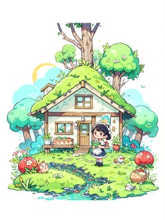 Spring, landscape illustration, (thatched cottage: 1.3), white walls, muddy roads, green rice fields, a small stream, distant snow mountains, grasslands, colorful flowers, trees, moss, grass, a little girl holding a flower basket, smiling expression, standing next to the fence of the farm, white silk, maid attire, double ponytails, black hair, looking right, children's illustration, gouache brush style, perfect composition,, A ink painting of a tranquil orchard with Chinese writing on it and a pair of birds building their nest, with a fruit-laden branch in the foreground, An Zhengwen, organic painting, a minimalist painting, art & language, ink and wash,