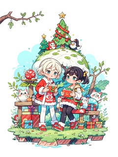 Christmas, elk, Santa Claus, gift, Snowflake, (Christmas trees), presents, Black pantyhose,lights,Christmas tree,1girl, full body,tutututu,Cleavage,With a gift in hand,(animal,cat),The shining stars,(Poster cover),snowman,(mountain),Outside, with Santa, 1girlHand drawn style, flat illustrations,, A ink painting of a tranquil orchard with Chinese writing on it and a pair of birds building their nest, with a fruit-laden branch in the foreground, An Zhengwen, organic painting, a minimalist painting, art & language, ink and wash,