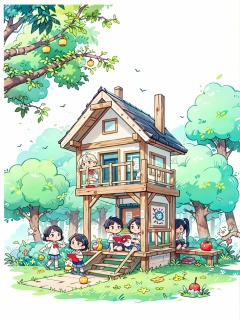 A group of children were carrying out a flag raising activity on the school playground, with many elementary school students wearing school uniforms,, A ink painting of a tranquil orchard with Chinese writing on it and a pair of birds building their nest, with a fruit-laden branch in the foreground, An Zhengwen, organic painting, a minimalist painting, art & language, ink and wash,