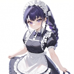 ,1girl, raiden_shogun, solo, maid, maid_headdress, hair_ornament, apron, braid, short_sleeves, dress, white_background, looking_at_viewer, alternate_costume, black_dress, enmaided, puffy_sleeves, frills, simple_background, twitter_username, white_apron, blush, mole, breasts, closed_mouth, waist_apron, puffy_short_sleeves, maid_apron, bow, white_bow, braided_ponytail, single_braid