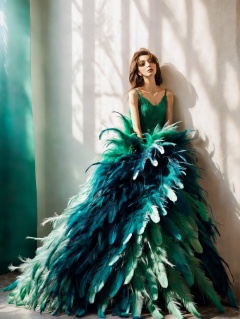 1girl,a gorgeous long dress made of feathers,green feather,huge feathers,complex background,beautiful background,(feathers everywhere:1.3),depth of field level,