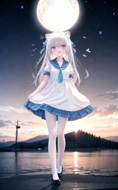 (cowboy shot,very long hair:1),50785533T,50785533T,50785533T,cute,Infant,solo blue shirt,blue sailor coat,loli,full body,white hair,snow leopard ear,white background,pink eyes,laugh,happy,white pantihose,white pantyhose,red armband,sunset,sunset,sunset,