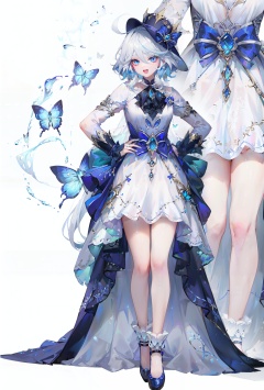 8k, best quality, masterpiece, (ultra-detailed:1.1), (high detailed skin), (full body:1.2), white background, standing, looking at viewer, solo, hand on hip, <lora:funingna-con-v100:0.8:lbw=OUTALL>, (flnother:1.2), (flndef:-1.1), (flndance:-1.1), dress, solo, butterfly, bug, white dress, full body, smile, bow, open mouth, hat, white hair, looking at viewer, blue headwear, blue eyes, blue footwear, standing, wedding dress, (white background, simple background,:1.2), <lora:GoodHands-vanilla:0.55>, ( good hands, nice hands:0.5), (beautiful_face), ((intricate_detail)), clear face, ((finely_detailed)), fine_fabric_emphasis, ((glossy)), full_shot
