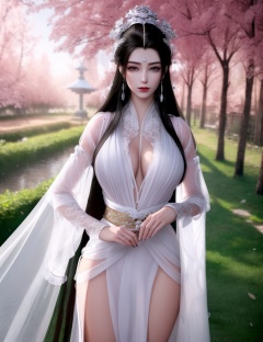 ultra realistic 8k cg, picture-perfect face, flawless, clean, masterpiece, professional artwork, famous artwork, cinematic lighting, cinematic bloom, perfect face, beautiful face, beautiful eyes, ((perfect female body, narrow waist)),fantasy, dreamlike, unreal, science fiction, huge breasts, beautiful clothes, lace, lace trim, lace-trimmed legwear, absurdly long hair, very long hair, (rich:1.4), prestige, luxury, jewelry, diamond, gold, pearl, gem, sapphire, ruby, emerald, intricate detail, delicate pattern, charming, alluring, seductive, erotic, enchanting, hair ornament, necklace, earrings, bracelet, armlet,(((((1girl, pov, outdoors,  absurdres, highres, ))))) , (1girl, fur trim, ,depth_of_field, solo, fur_collar, earrings, see-through, looking_at_viewer, hanfu)<lora:DA_YueYao:0.7>